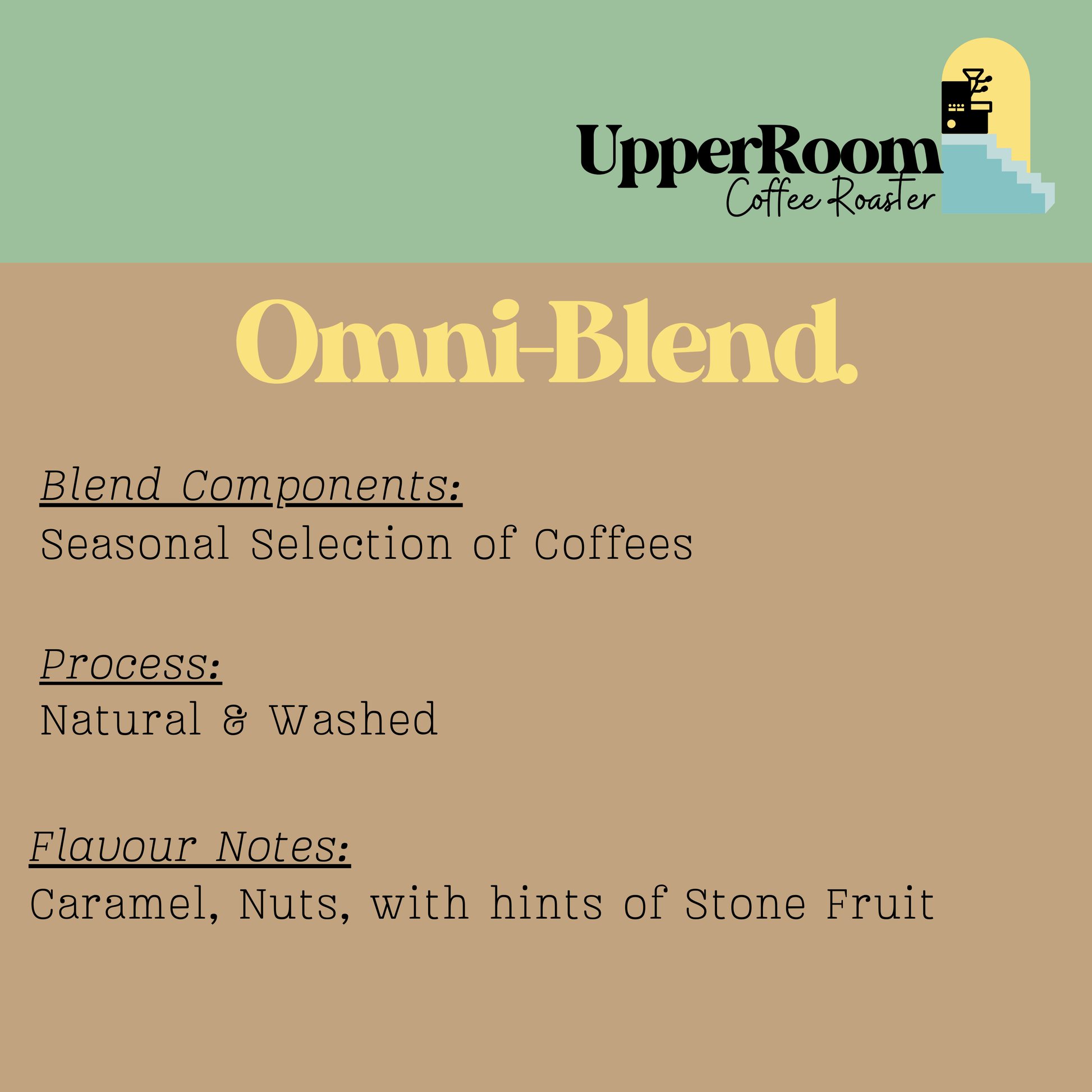 Omni-Blend is UpperRoom's signature house blend, designed for coffee enthusiasts who appreciate a well-balanced cup. Crafted for versatility, it’s roasted to shine through with any brewing method, making it perfect for enjoying anywhere, anytime.